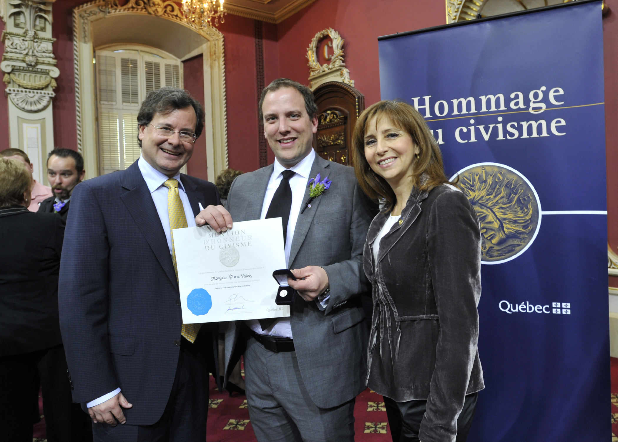 (BOUCHERVILLE, le 26 novembre 2013) – C’est au Salon Rouge du Parlement du Québec qu’avait lieu le 25 novembre dernier la cérémonie de remise des mentions d’honneur du civisme. Un Montarvillois, Monsieur Pierre Valois de Boucherville, s’est vu décerner cette mention d’honneur du civisme.