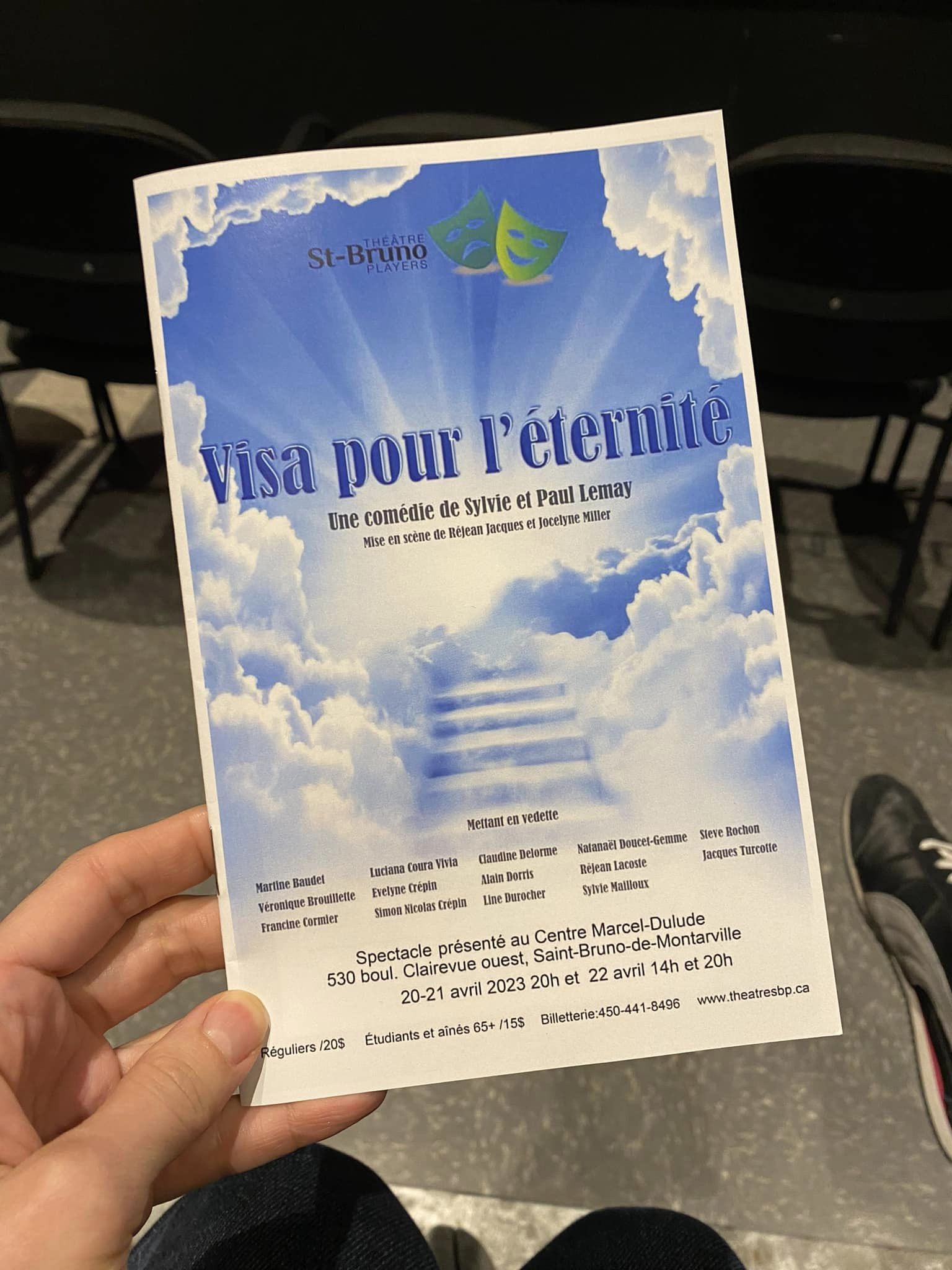 J’ai passé une agréable soirée hier en compagnie des artistes et artisans du Théâtre St-Bruno Players qui nous ont offert la pièce Visa pour l’éternité.